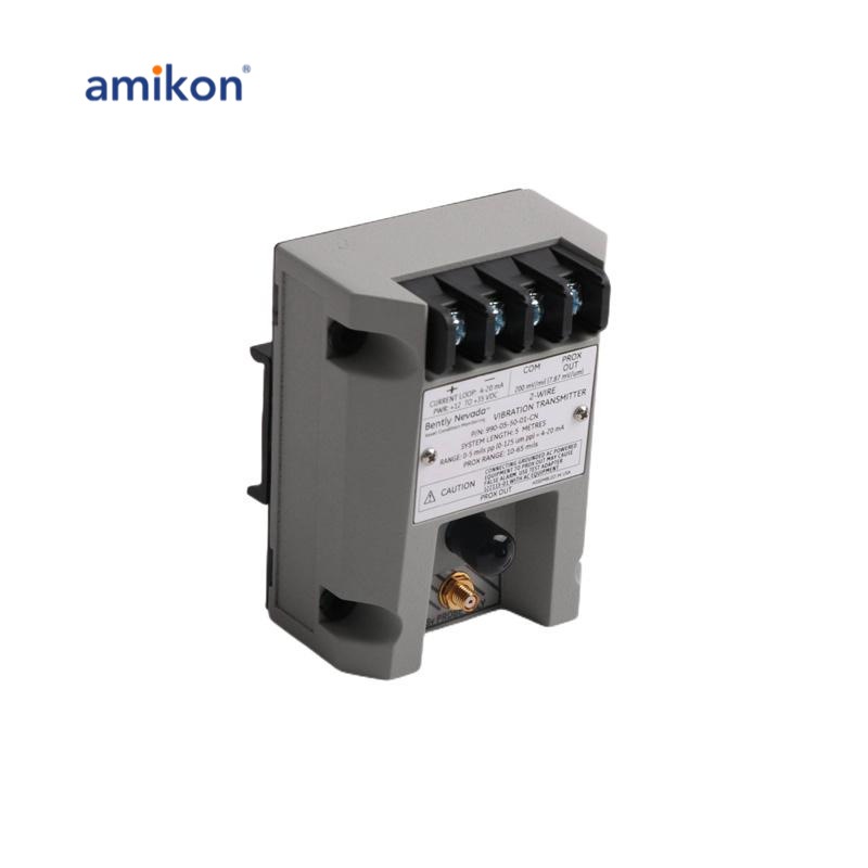 O transmissor é um dispositivo alimentado por loop de 2 fios que aceita entrada de nossa sonda de proximidade 3300 NSv* e seu cabo de extensão correspondente (disponível em opções de comprimento de sistema de 5 m e 7 m).