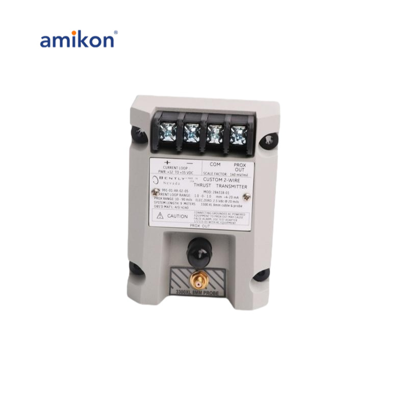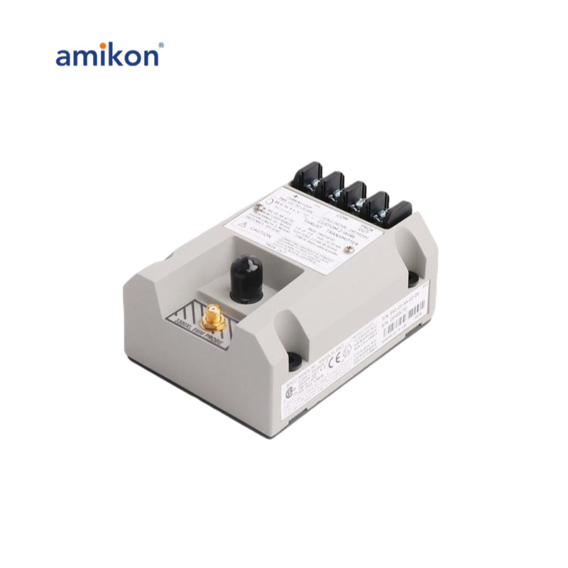 O transmissor é um dispositivo de 2 fios alimentado por loop que aceita entrada de nossa sonda de proximidade 3300 NSv* e seu cabo de extensão correspondente (disponível em opções de comprimento de sistema de 5 m e 7 m).